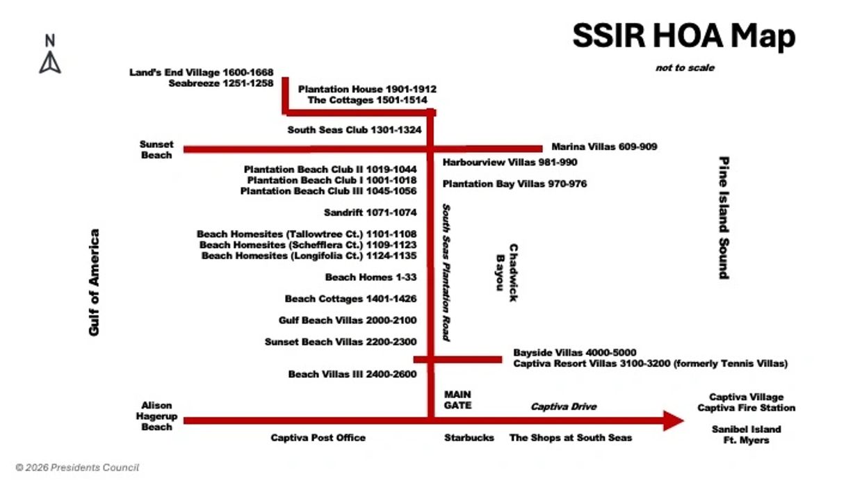 This map is a graphical representation of the private homeowner associations located within South Seas Island Resort.